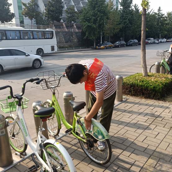 摆放清洁共享单车的过程中,同学们都很仔细认真,看到有摆放得不好的共享单车会立马主动上前去把它们移到别的地方。最后在志愿者们辛勤的工作下,路边的共享单车都被归类好,清洁的干净了。