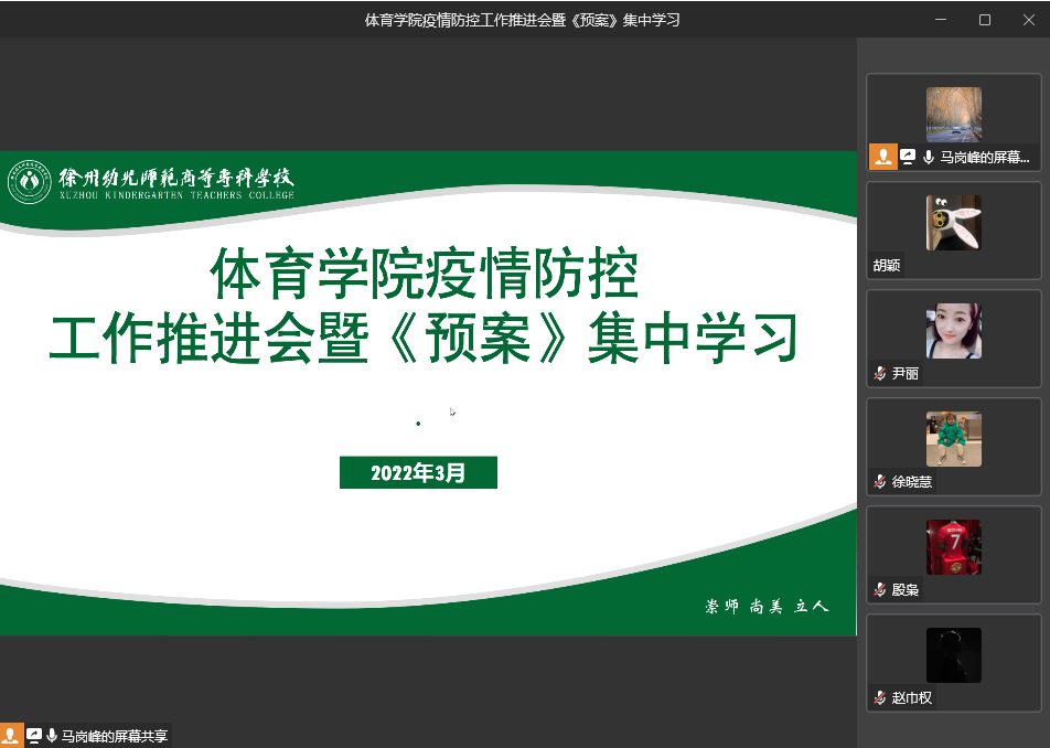 马书记传达了江苏省教育厅以及公司疫情防控领导小组关于近期校园疫情防控工作的相关会议精神和工作要求。会议要求全体教职工要始终把疫情防控工作摆在首位,从严从实落实疫情防控责任。针对目前疫情防控以“外防输入”为工作重点的前提下,一方面要提高政治站位,一切听从指挥,要求全体教职工非必要不离徐,返徐必须提供24小时内的核酸检测阴性证明;要求全体师生每天必须全员进行健康汇报;要求辅导员班主任保持疫情防控的“战时状态”,加强对员工的封闭管理,落实各项疫情管理制度;另一方面要求辅导员班主任摸清员工状况,员工请假从严从紧,关注员工心理,避免产生恐慌情绪。做好个人防护、测温验码、通风消毒等防控措施。随后,马书记带领大家一起学习了《江苏省校园突发新冠肺炎疫情应急处置预案》,本方案主要介绍校园内出现阳性病例之后,公司应该如何应急处置。学习之后,老师们感受到了疫情严峻的形势,纷纷表示会后将继续认真学习贯彻。