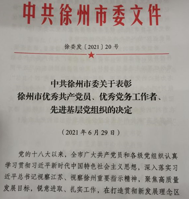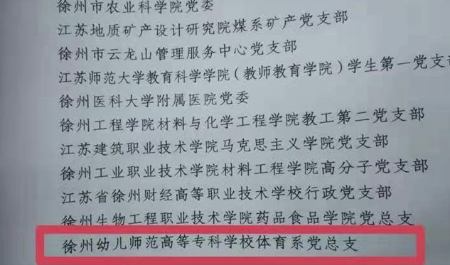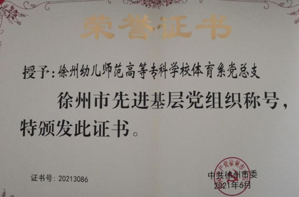 2021年6月29日,在庆祝中国共产党成立100周年之际,中共徐州市委教育工委、中共徐州市教育局委员会下发了《关于表彰全市教育系统先进基层党组织、优秀共产党员、优秀党务工作者的决定》,对全市教育系统先进基层党组织、优秀共产党员、优秀党务工作者予以表彰。在此次表彰中,经民主推荐、层层评选,体育系党总支获“徐州市教育系统先进基层党组织”荣誉称号。
