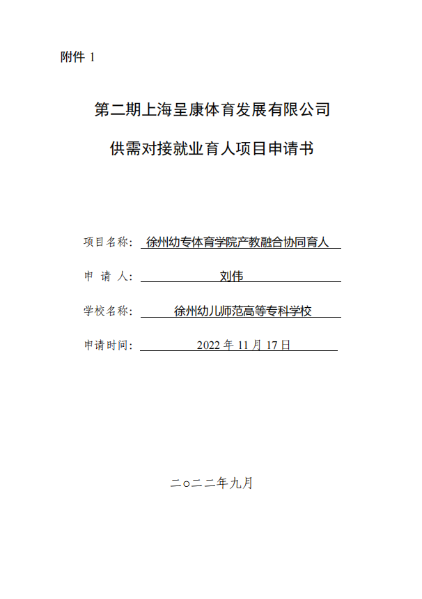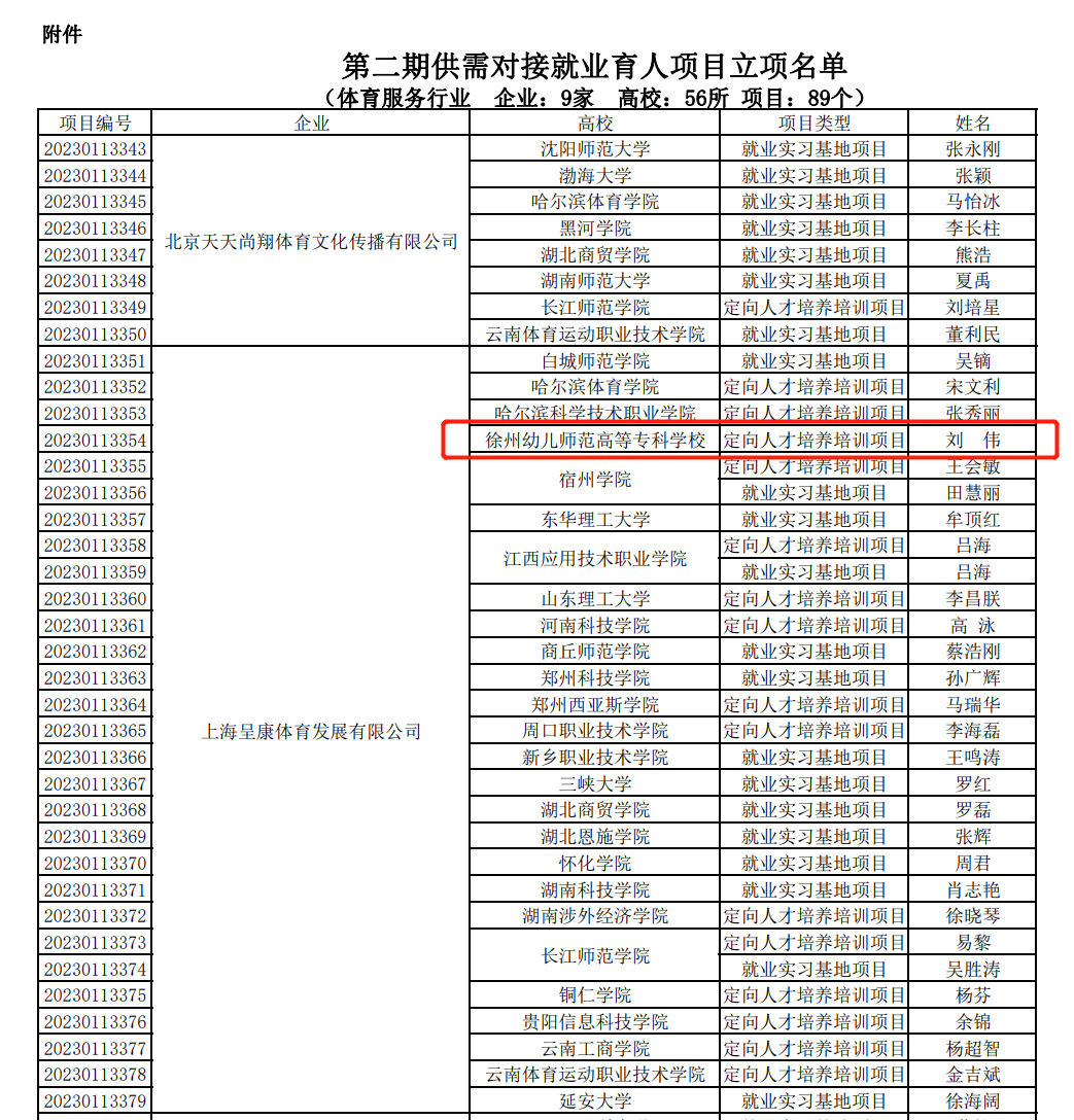 近日,教育部高校员工司公布第二期供需对接就业育人项目立项名单,公司与上海呈康体育有限公司合作的定向人才培养培训项目“徐州幼专必一运动产教融合协同育人”(项目负责人:刘伟、刘东亮、闻年富、殷枭、田国祥、张东)成功立项。