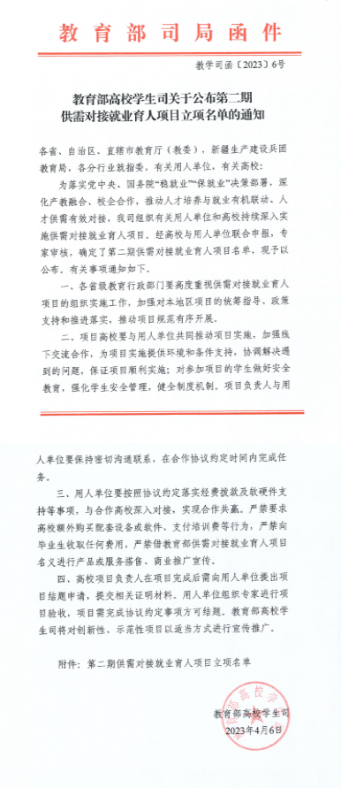 为落实党中央、国务院“稳就业”“保就业”决策部署,教育部高校员工司实施了2023年供需对接就业育人项目,经高校申请、用人单位申报、专家审核、立项单位信息核查,确定了第二期供需对接就业育人项目名单。