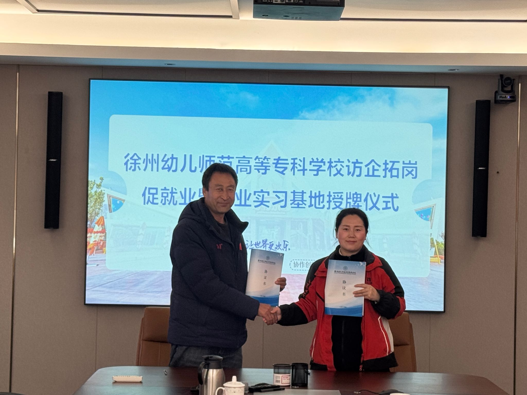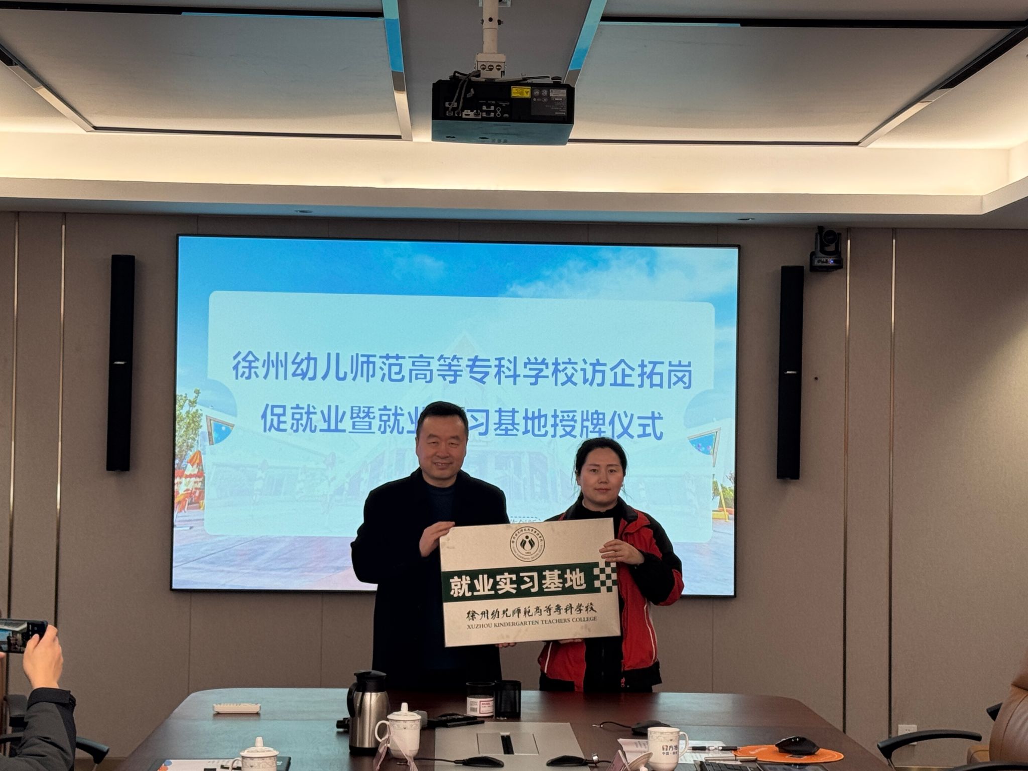 接着,双方就人才培养、校企合作、深化产教融合等充分交换了意见。田国祥与徐州方特乐园代表签署合作协议,邓宪亮为徐州方特乐园授牌“就业实习基地”。