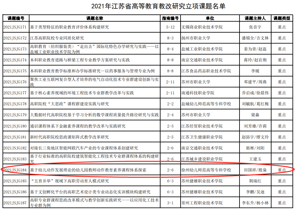 根据《关于公布2021年江苏省高等教育教改研究立项课题评选结果的通知》(苏高教会〔2021〕42号),由我系田国祥教授和殷枭老师申报的《基于幼儿动作发展理论的幼儿园教师动作教育素养课程体系探索》获得重点课题立项。我系前期组织教师积极申报,经体育系审核,教务处邀请专家评审,最终我系田国祥教授和殷枭老师共同主持的课题被推荐上报并获得重点课题立项,取得了我系在该项目中的历史性突破。