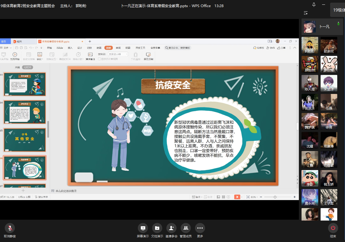 根据公司员工工作部署和疫情防控常态化要求,为提高同学们假期安全防范意识,引导同学们合理规划寒假生活,体育系各班级于1月25-27日召开了主题班会,以确保全体员工度过一个安全、文明、健康的假期。