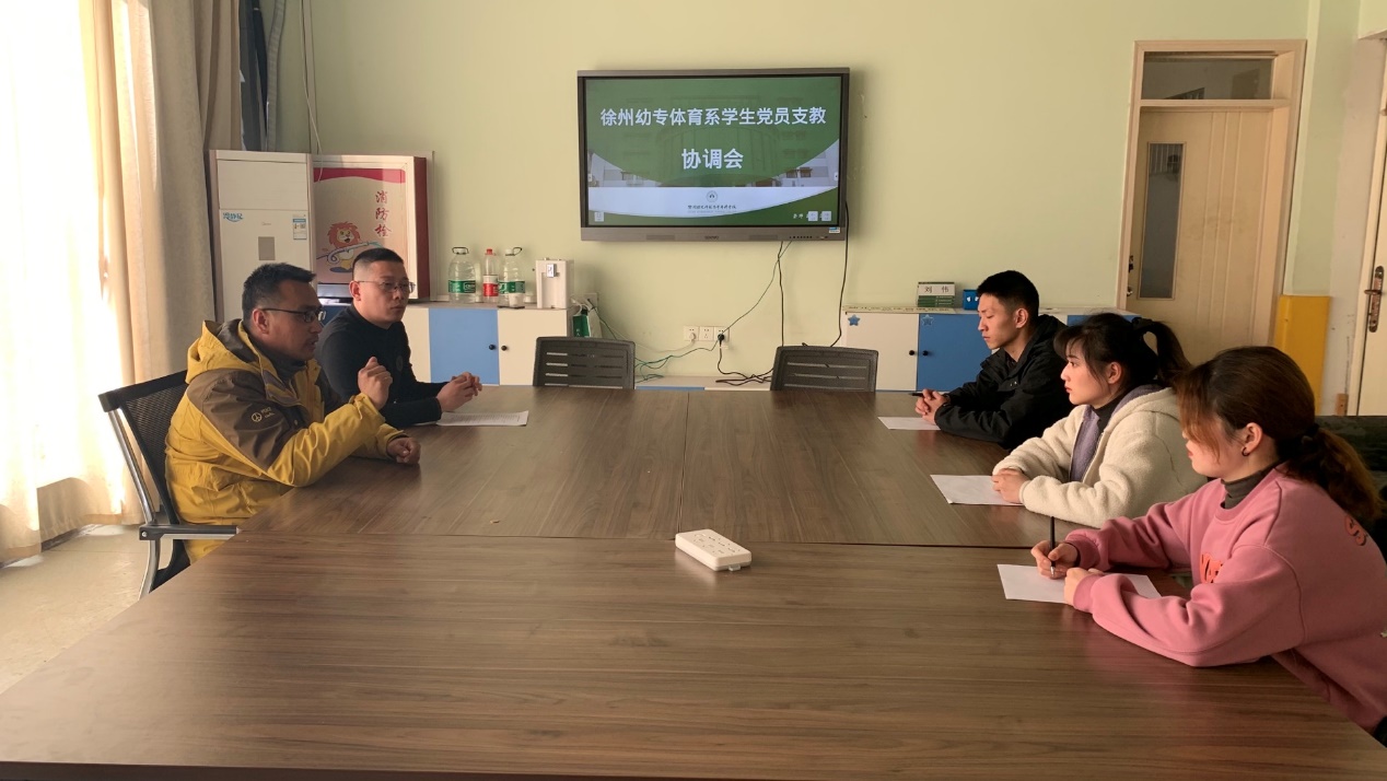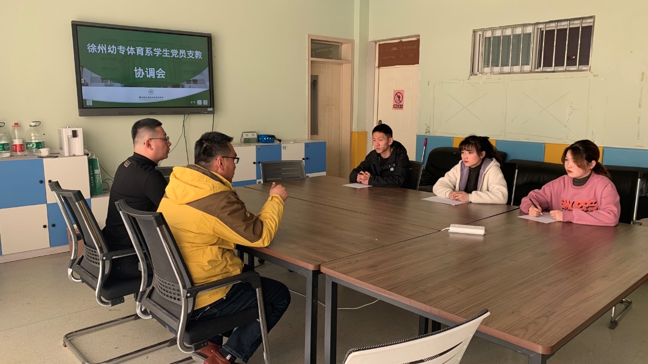 3月22日,在体育场一楼办公室召开体育系员工党员支教协调会,参加会议的有体育系党支部副书记马岗峰、党支部宣传委员殷枭和三名员工党员,会议由支部宣传委员殷枭主持。