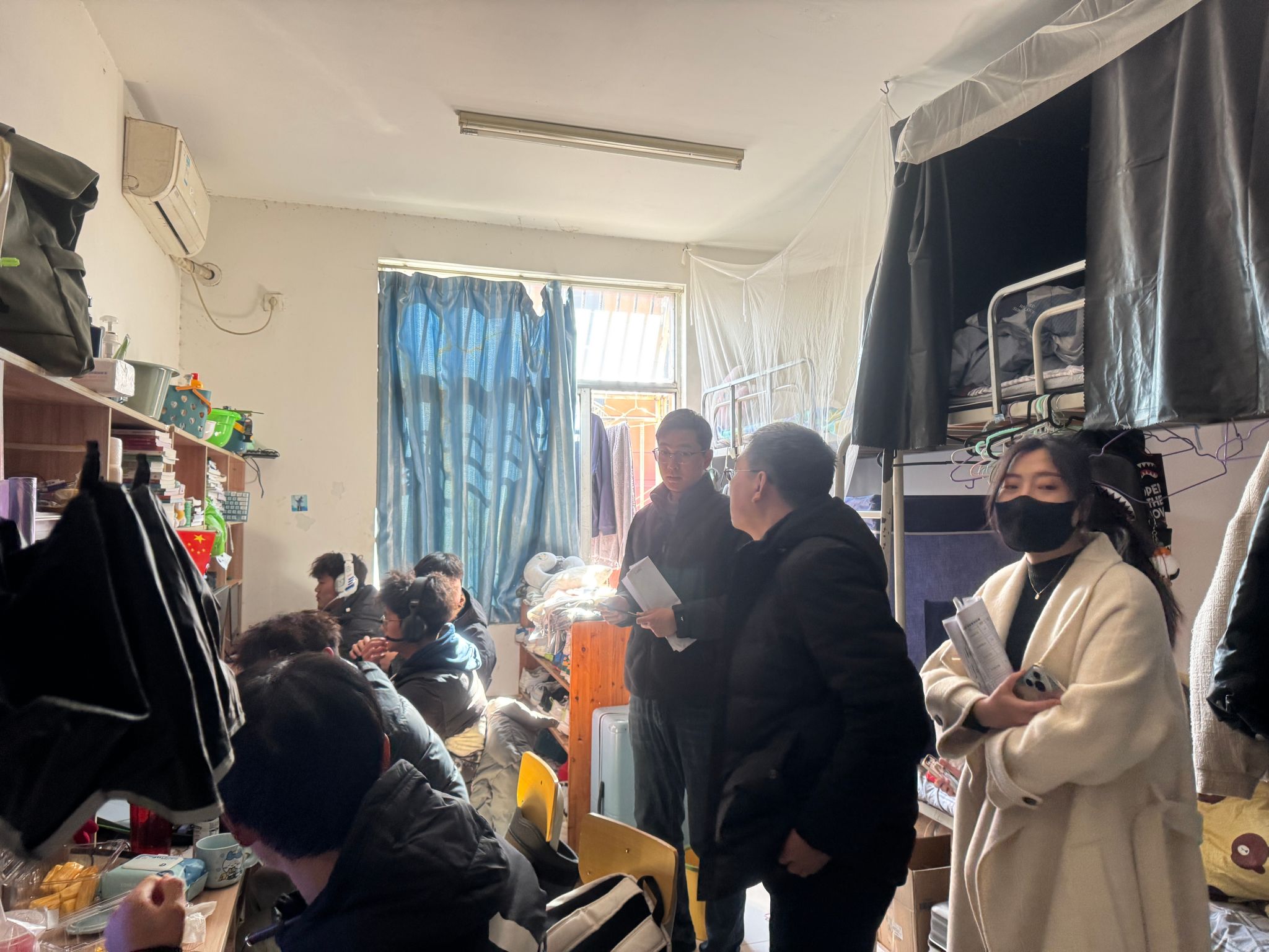 为筑牢校园安全防线,营造文明健康的生活环境,公司于2月24日组织开展了春季学期员工公寓安全卫生专项检查。本次行动由公司党总支副书记刘东亮,辅导员罗吉席、徐林楠,行政秘书王旭婕参加,通过"查、访、教"相结合的方式,对全院员工宿舍进行全覆盖式检查。
