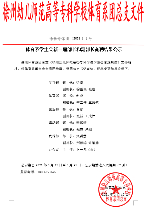 体育系员工会新一届部长和副部长竞聘结果公示