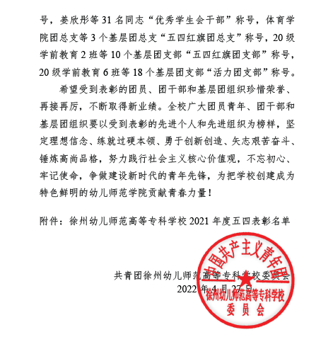 必一运动团总支获“五四红旗团总支”称号,20级体育教育2班获“五四红旗团支部”称号,20级体育教育1班获“五四活力团支部”称号,21级体育教育2班获“青年大学习先进集体”称号,殷枭和胡颖老师获“共青团关心支持奖”,张杰同学获“五四最美青年标兵”称号,熊伟萍同学获“五四十佳魅力团支书”称号,王逸航、卢颖同学获“优秀共青团干部”称号,张程、王涛、王露、卞家伟同学获“优秀共青团员”称号,王成伟、许智腾同学获“优秀员工会干部”称号,范伊阳、杨帆同学获“青年大学习学习之星”称号。