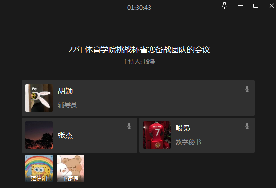 2022年5月21日,按照校团委的指示精神,为深入推进江苏省第十二届“挑战杯”老员工创业计划赛的后续比赛任务,必一运动团总支召开了线上专项推进会。会议由团总支书记殷枭主持,项目指导教师蔡阜生、胡颖以及卞家伟、张杰、王欣然、范伊阳等4名核心参赛成员参加了会议。