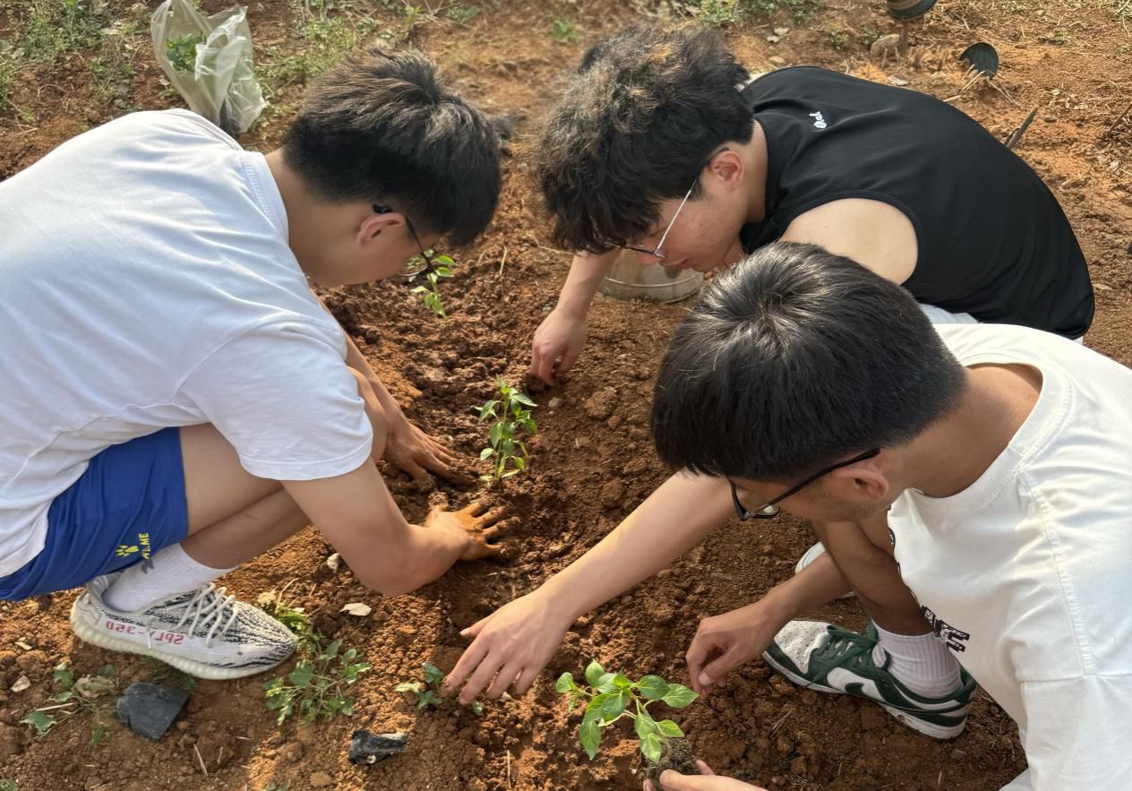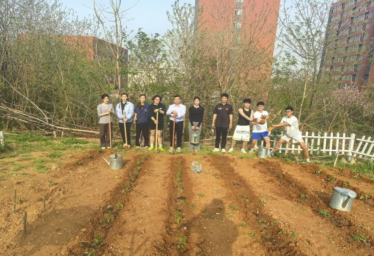 翻土小组的同学们轮流上阵,铁锹翻飞的节奏如同训练时的接力配合;播种分队的成员们细心地将菜苗植入土中,动作轻柔得像对待奖杯一般;徐林楠老师笑称:“咱们体育人干什么都要讲‘技术动作’——弯腰播种得稳,挥锹发力要准!