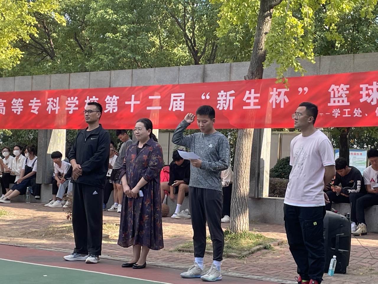 运动员代表邓佳松发言,承诺遵循“安全第一、友谊第二、比赛第三”的原则。裁判代表耿子奇郑重承诺裁判组将会遵守公平公正公开的原则,使篮球赛有序进行。郁超然老师强调了本次比赛的重要意义,以及遵守规则和体育道德的重要性。