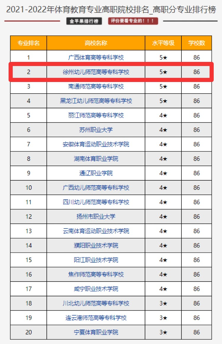 近日,“金平果排行榜”最新发布的《2021-2022年体育教育专业高职院校分专业排行榜》中,公司体育教育专业在全国86所开设该专业的院校排名中保持全国第二名。这次排名,是深层次、多维度对公司体育教育专业建设“量”和“质”的观测与评价,也是获得社会评估机构对体育教育专业获评校级品牌专业建设以来的又一肯定。