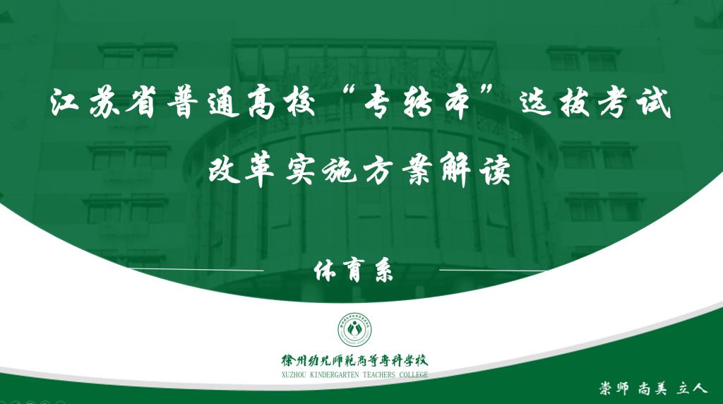 12月30日下午,江苏省普通高校“专转本”选拔考试改革实施方案解读宣传会在碧螺校区学术报告厅召开,体育系副主任闻年富、教学秘书徐晓慧和2018级、2019级、2020级全体同学参加会议,会议由徐晓慧主持。