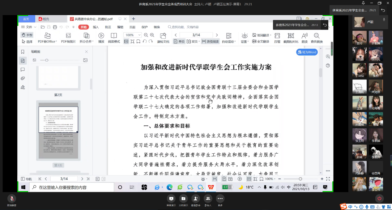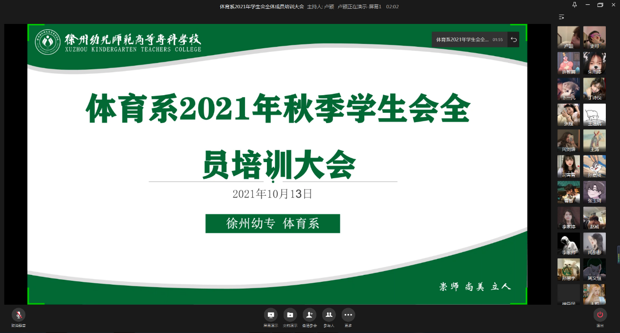2021年10月15日下午,体育系团总支召开了2021—2022第一学期员工会工作人员线上培训会议,体育系团总支书记殷枭及员工会全体成员参加了会议,会议由组织部卢颖主持。