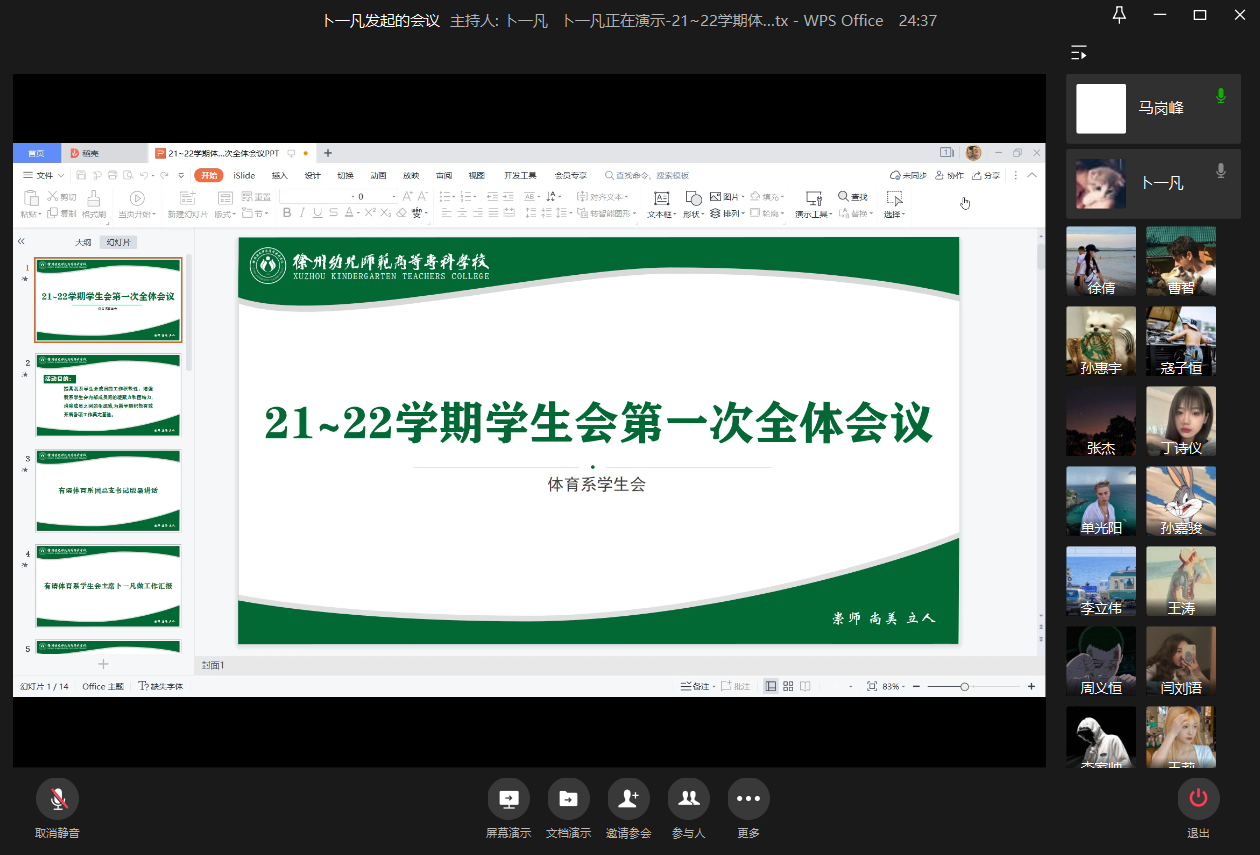 2021年9月8日下午,体育系团总支召开了2021—2022第一学期员工会全体干部会议,会议由员工会主席卜一凡主持,体育系副书记马岗峰、团总支书记殷枭、辅导员胡颖及所有员工会干部参与本次会议。