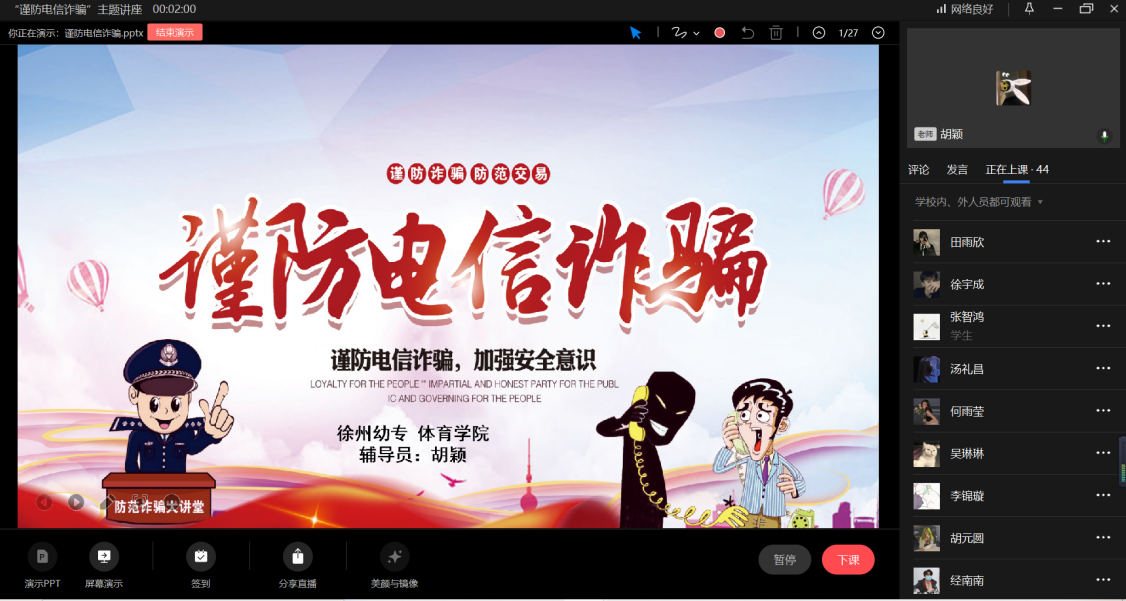 为进一步增强公司员工预防电信诈骗的意识,防止电信诈骗事件的发生。公司于3月7日召开了“谨防电信诈骗”线上主题班会。会议由辅导员胡颖老师主持,20级、21级全体员工参加。