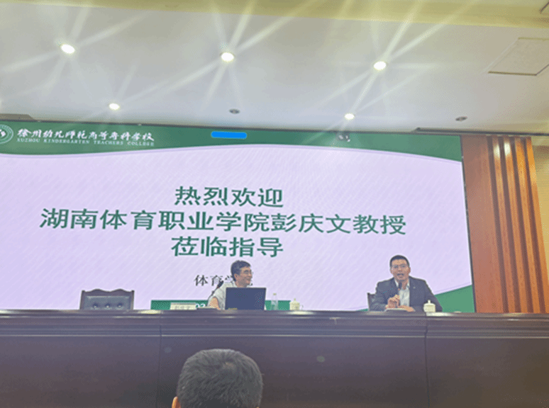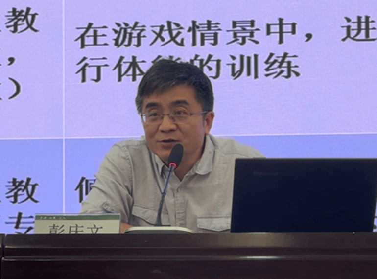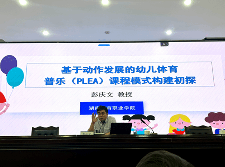 彭庆文教授2004年考入清华大学人文公司,师从清华大学原党委书记陈希,从事高等教育管理与大学体育的研究,2009年获教育学博士学位,2014年——2015年赴美国俄亥俄州立大学教育与生态公司访学,现任湖南体育职业公司党委副书记、副董事长。彭教授在两个多小时的讲座中,用生动的语言和丰富的个人经历深入浅出地讲述了幼儿体育的重要性以及普乐(PLEA)课程模式构建的思想基础。彭教授先从研究背景、概念界定介绍幼儿体育的重要性,接着讲授以“玩、学、练、秀”四种活动形态作为课程实施抓手的普乐课程,最后分享了教学成果奖案例——《运动训练专业群卓越体育工匠培养的五环模式研究与实践》,彭教授把深奥的知识具体化、生动化、易懂化。在整个讲座过程中,彭教授精神饱满、语言诙谐,会议室内响起经久的掌声。