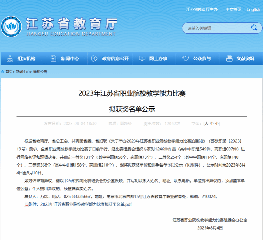 202384日,由江苏省教育厅、江苏省总共工会、共青团江苏省委、江苏省妇联联合举办的2023年江苏省职业院校教学能力比赛结果在江苏省教育厅网站公示,经过网络初审、现场决赛,必一运动蔡阜生、郁超然、郭盼盼、闻年富教学团队的参赛作品《老年常见疼痛运动处方数智制定与实施》荣获一等奖。