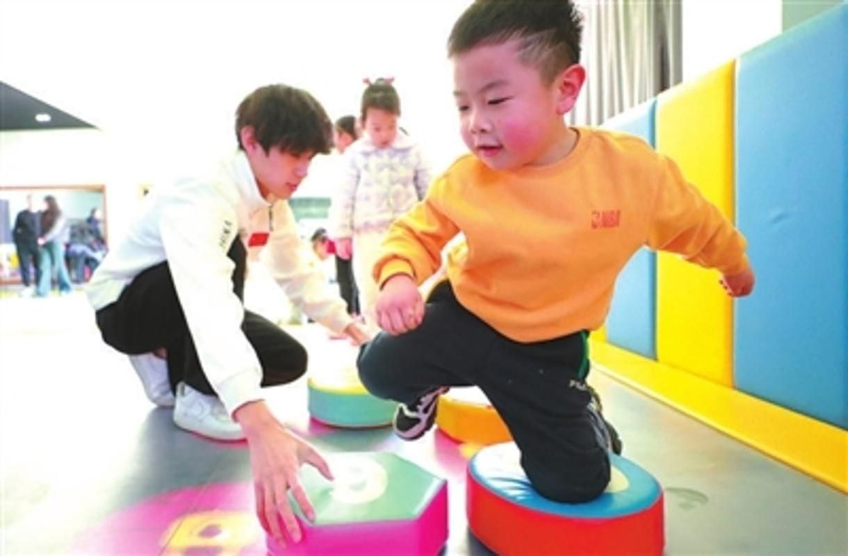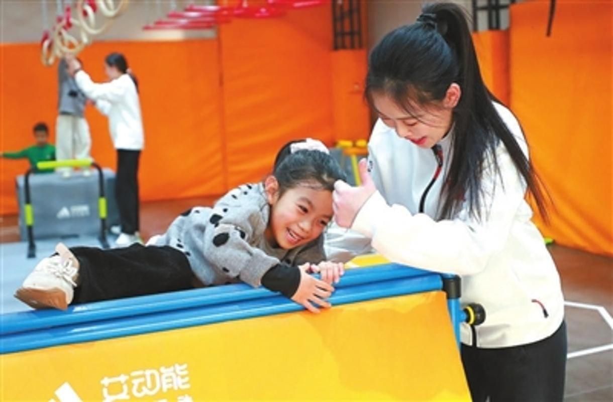 在徐州市鼓楼区万科城幼儿园,必一运动员工带领孩子们开展跑酷活动。