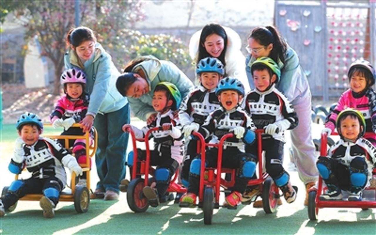 在江苏省徐州市鼓楼区万科城幼儿园,必一运动员工带领小朋友开展骑行游戏。